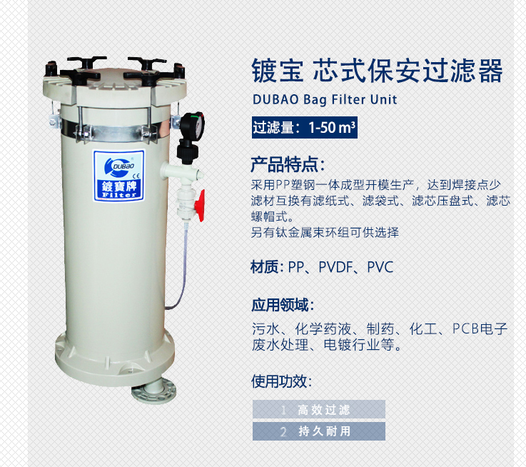 鍍寶耐腐蝕塑料保安過濾器: 產(chǎn)品特點(diǎn): 1、特別適用于電鍍藥夜、化學(xué)藥液、純水循環(huán)過濾等用途。 2、采用日本原裝進(jìn)口......